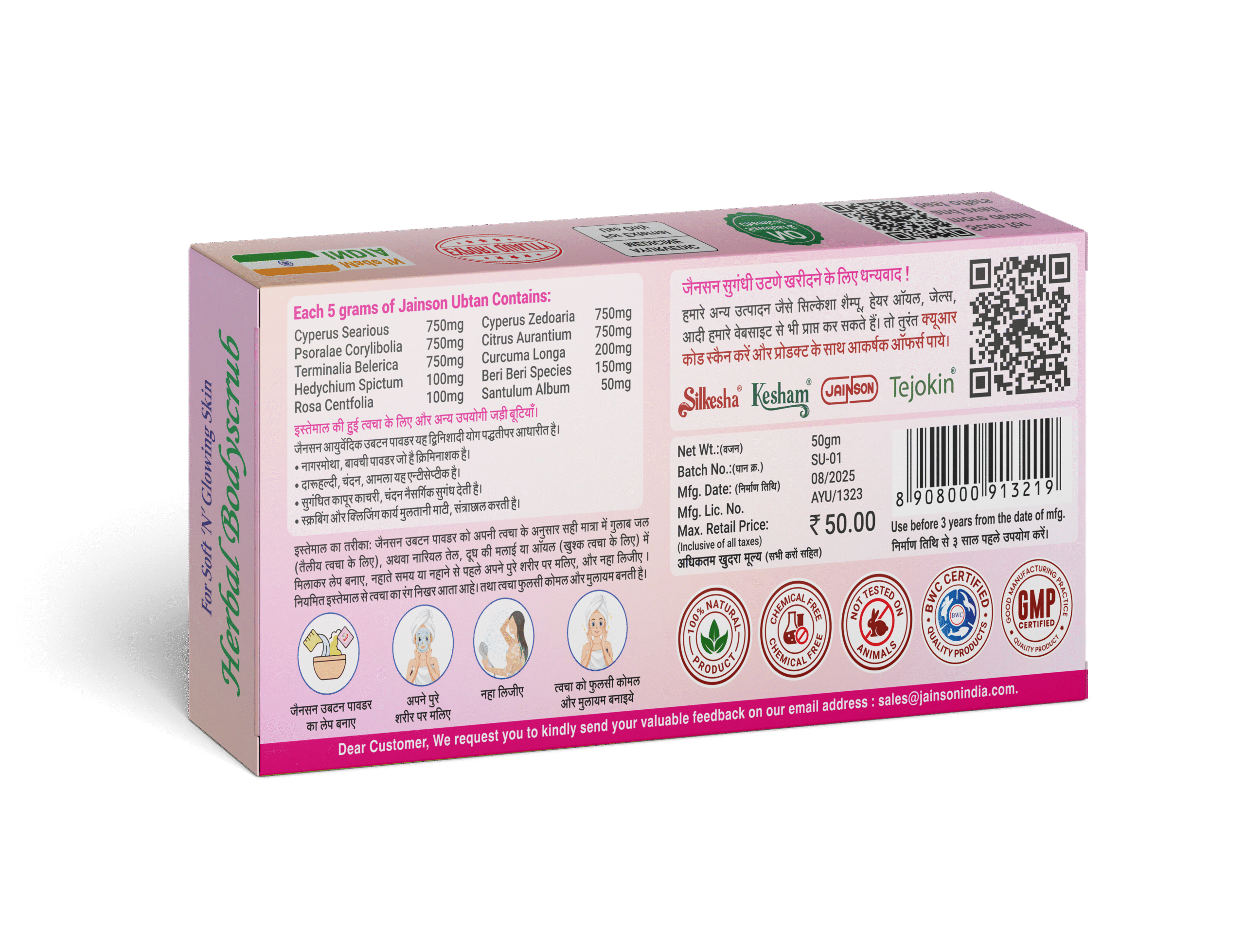 Jainson Ayurvedic Ubtan Powder is a traditional Ayurvedic skin care formula based on the authentic Dwinishadi Yog Chikitsa, known for its powerful cleansing and rejuvenating properties. This natural herbal ubtan gently exfoliates, detoxifies, and nourishes the skin, leaving it soft, radiant, and glowing.